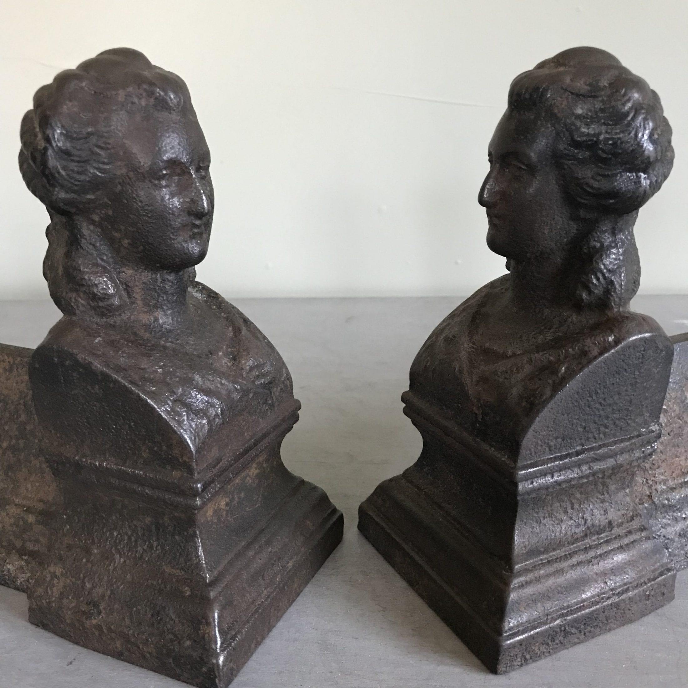 A really fabulous pair of cast iron 19th Century French ‘Firedogs’ or andirons.  Andirons were used to hold the wood in a fireplace.