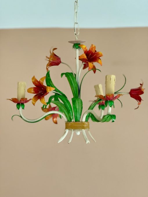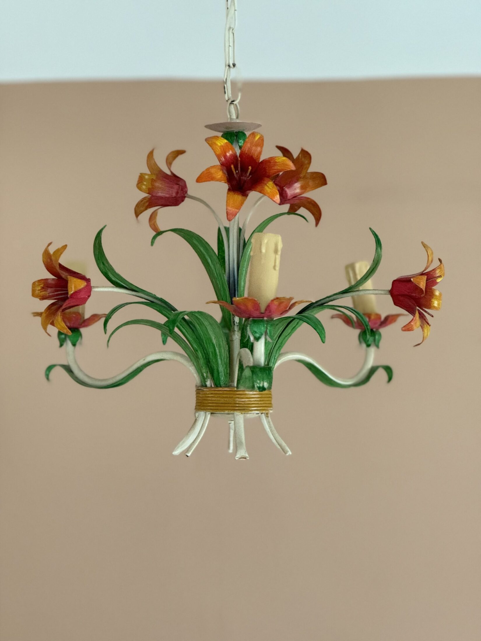 Such a pretty and vibrant vintage French painted tole, floral ceiling pendant with orange/red Lillys, green leaves and three candle drip lights.