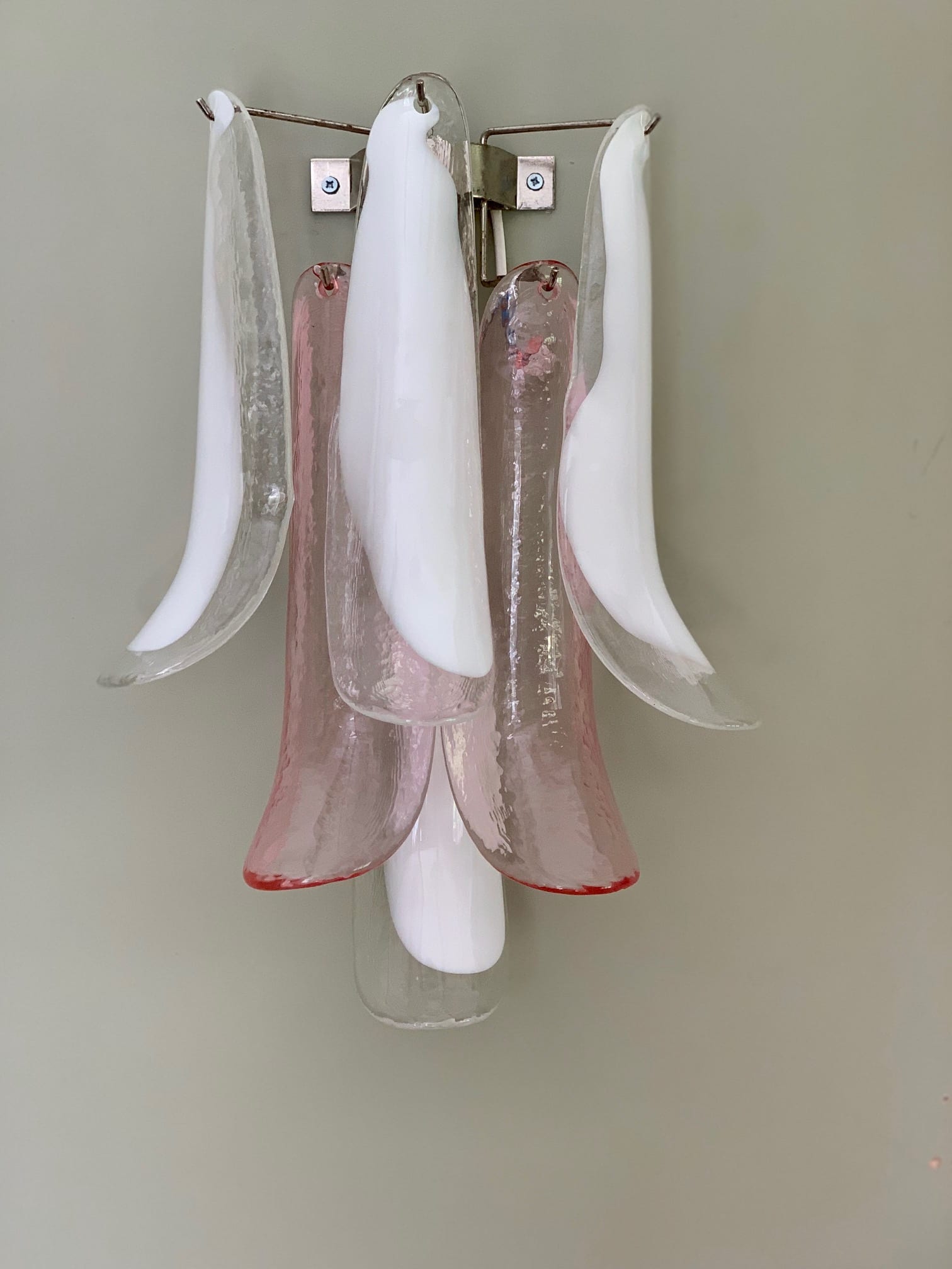 Just such a wonderful pair of Italian Murano wall lights, with the pretties of pink, hand blown glass and white glass curls, set on a typical stainless steel bracket.  Very 1970s.