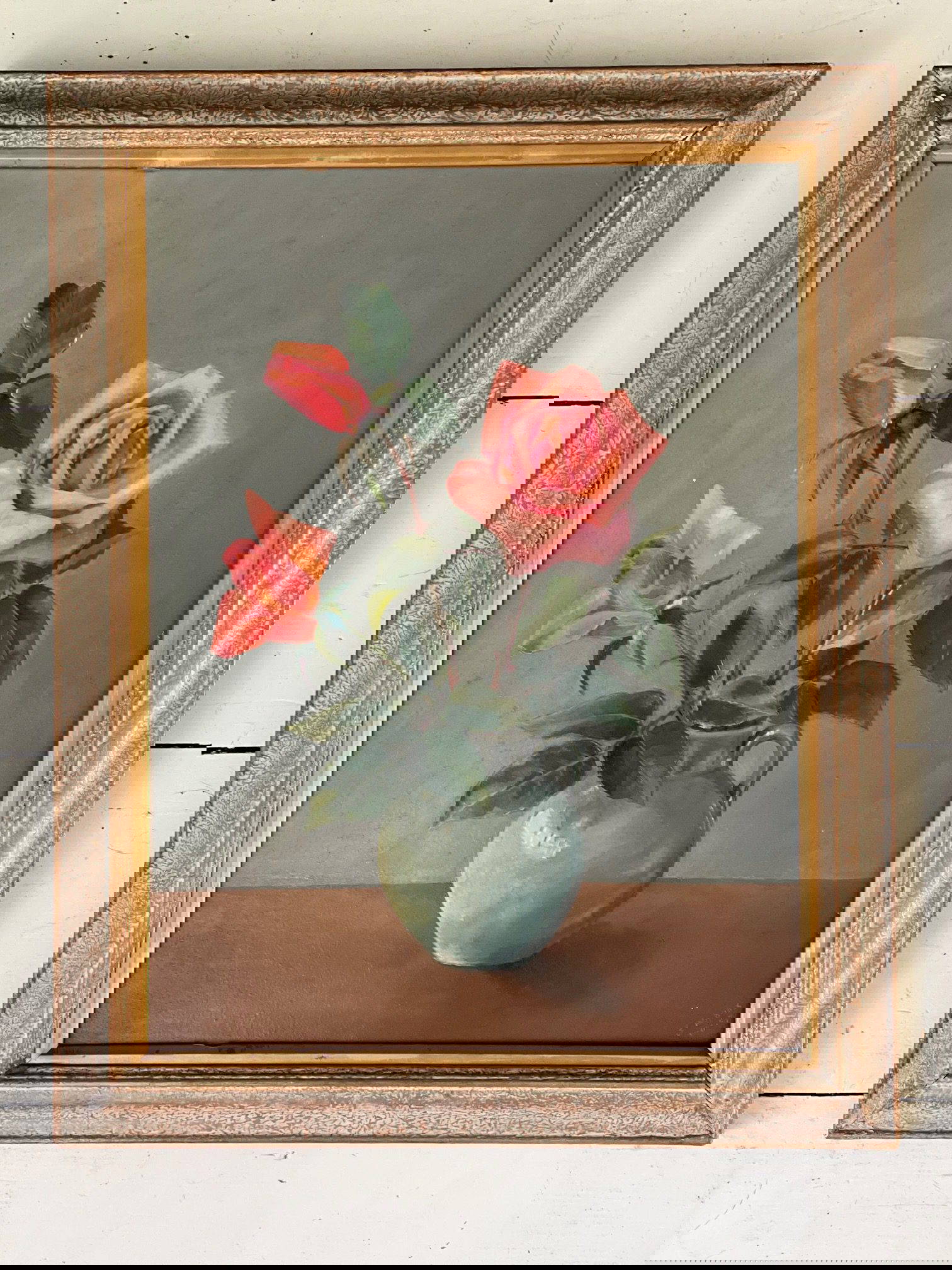 Such a pretty Mid Century oil on board of ‘Roses in a green vase’ in original wooden frame.  Finely painted, signed by the artist.
