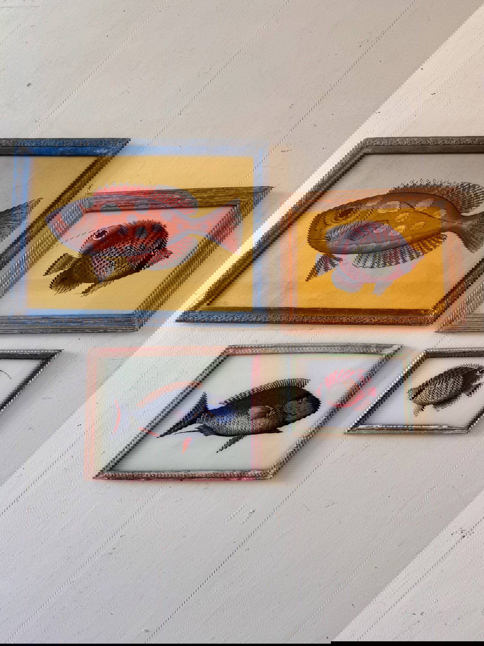 A charming collection of vintage Indian Reverse glass paintings of various fish! Have been curating these for a while as so bright and fun!