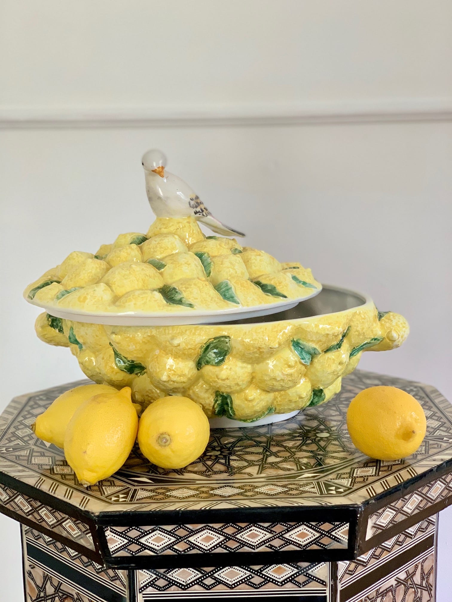 This is such a beautiful Italian lemon-encrusted Tureen dish with the prettiest Turtle Dove on top as the handle.